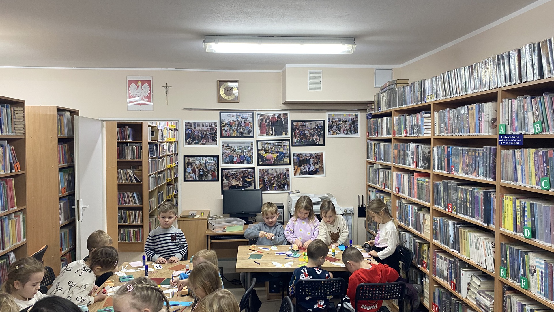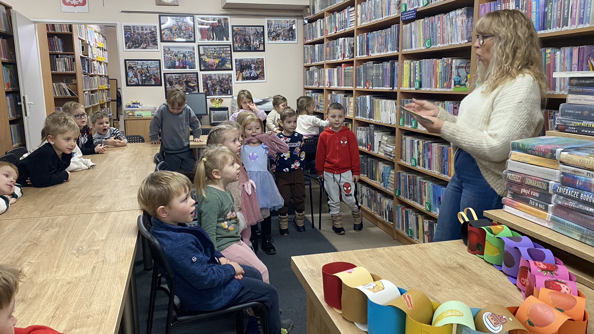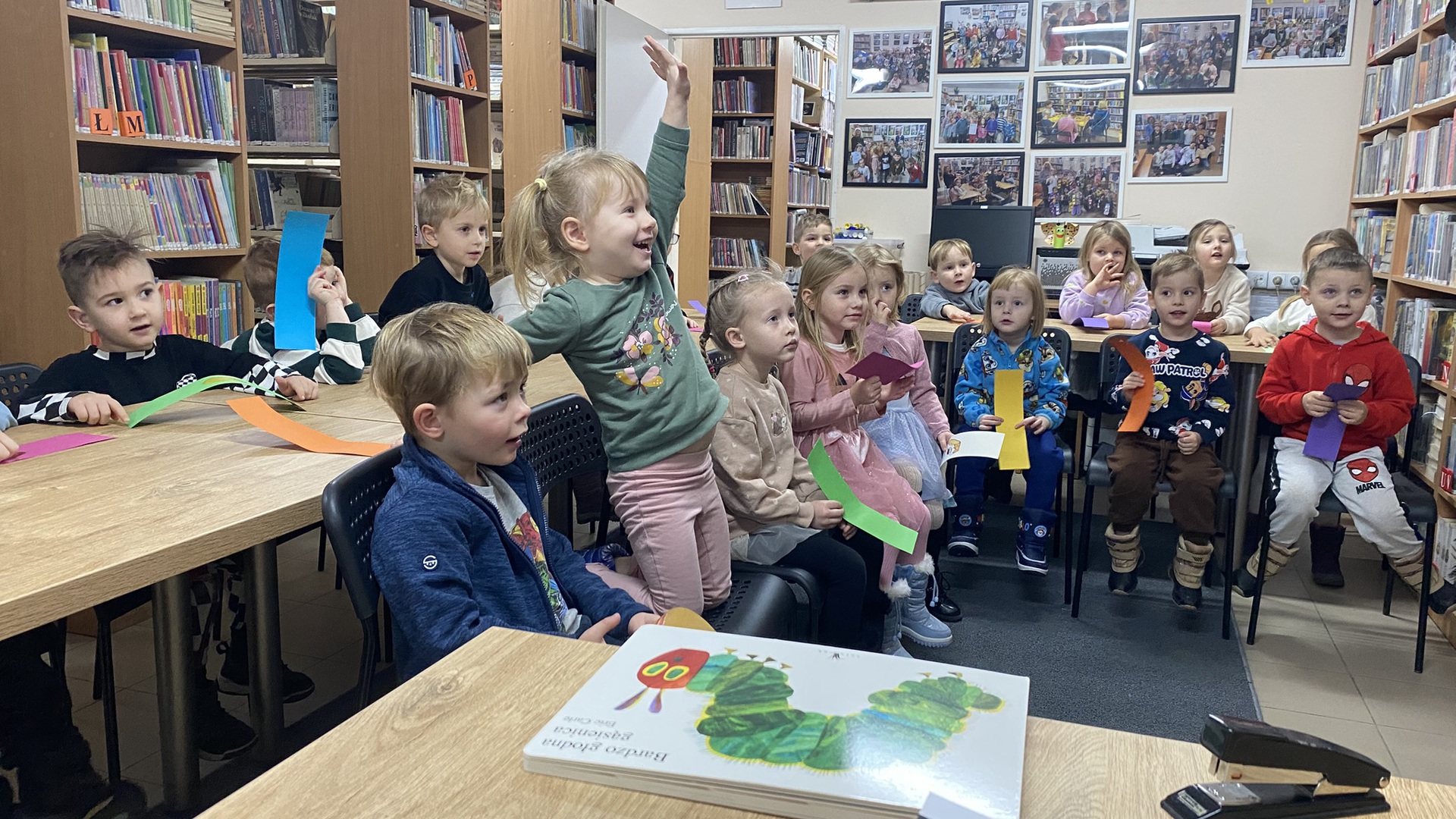 Czterolatki z ciekawością oglądały półki pełne książek, w których rozpoznawały ulubionych bohaterów z bajek, które czytają im rodzice. Z dużym zainteresowaniem wysłuchały bajki Erica Carle "Bardzo głodna gąsienica" uczestnicząc jednocześnie w tworzeniu długiej, żarłocznej gąsienicy. Podczas czytania utrwalały sobie znajomość liczb i dni tygodnia. Dzieci poznały proces przeobrażenia się gąsienicy w motyla - którego szablon pomalowały i ozdobiły cekinami, świetnie się przy tym bawiąc. Już wiemy, że jeszcze nieraz spotkamy się w bibliotece.