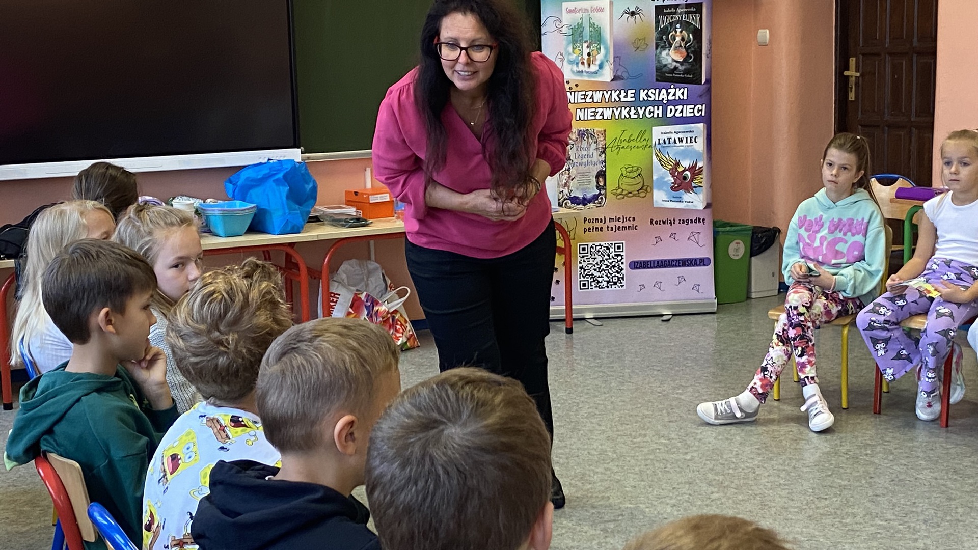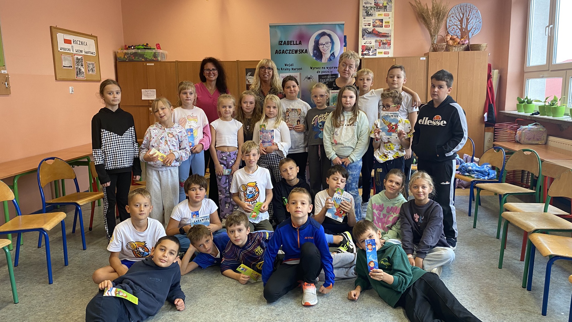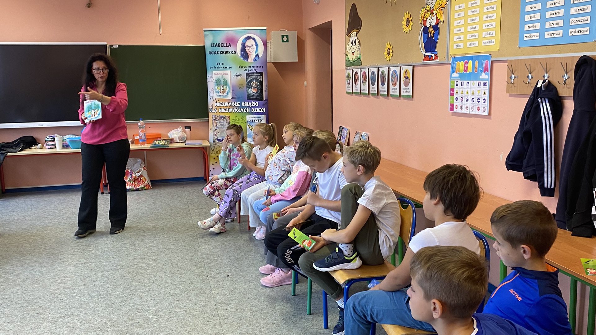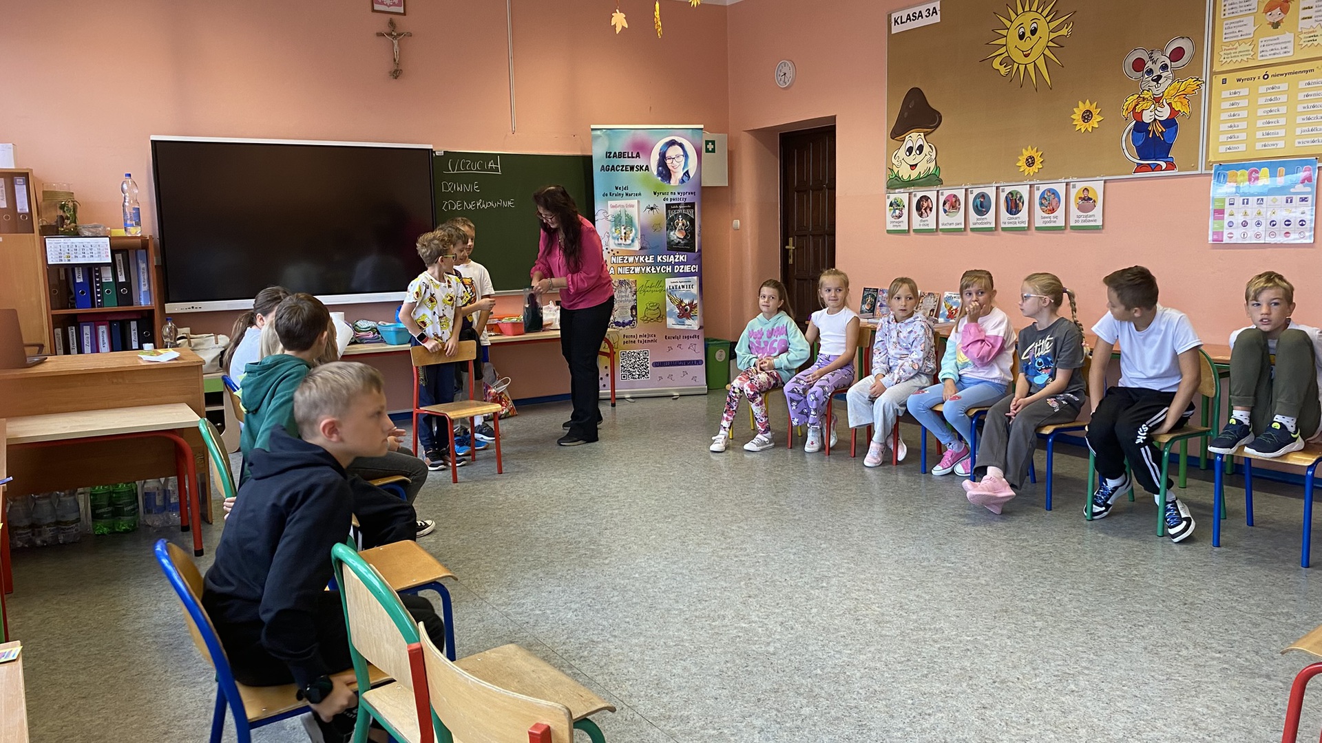 Wrześniowe spotkanie autorskie organizowane dla dzieci przez Gminną Bibliotekę Publiczną w Chełmcu tym razem odbyło się poza murami biblioteki. Z autorką p. Izabellą Agaczewską gościłyśmy w Szkole Podstawowej w Biczycach Dolnych w klasie IV oraz Szkole Podstawowej w Chełmcu w klasie III.