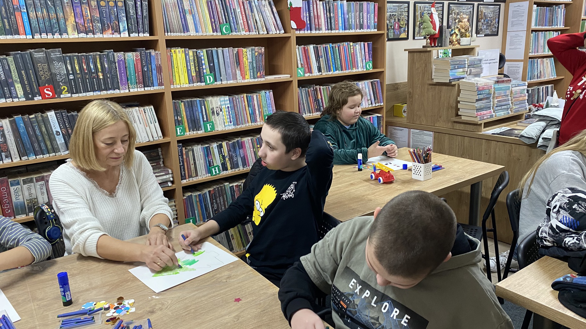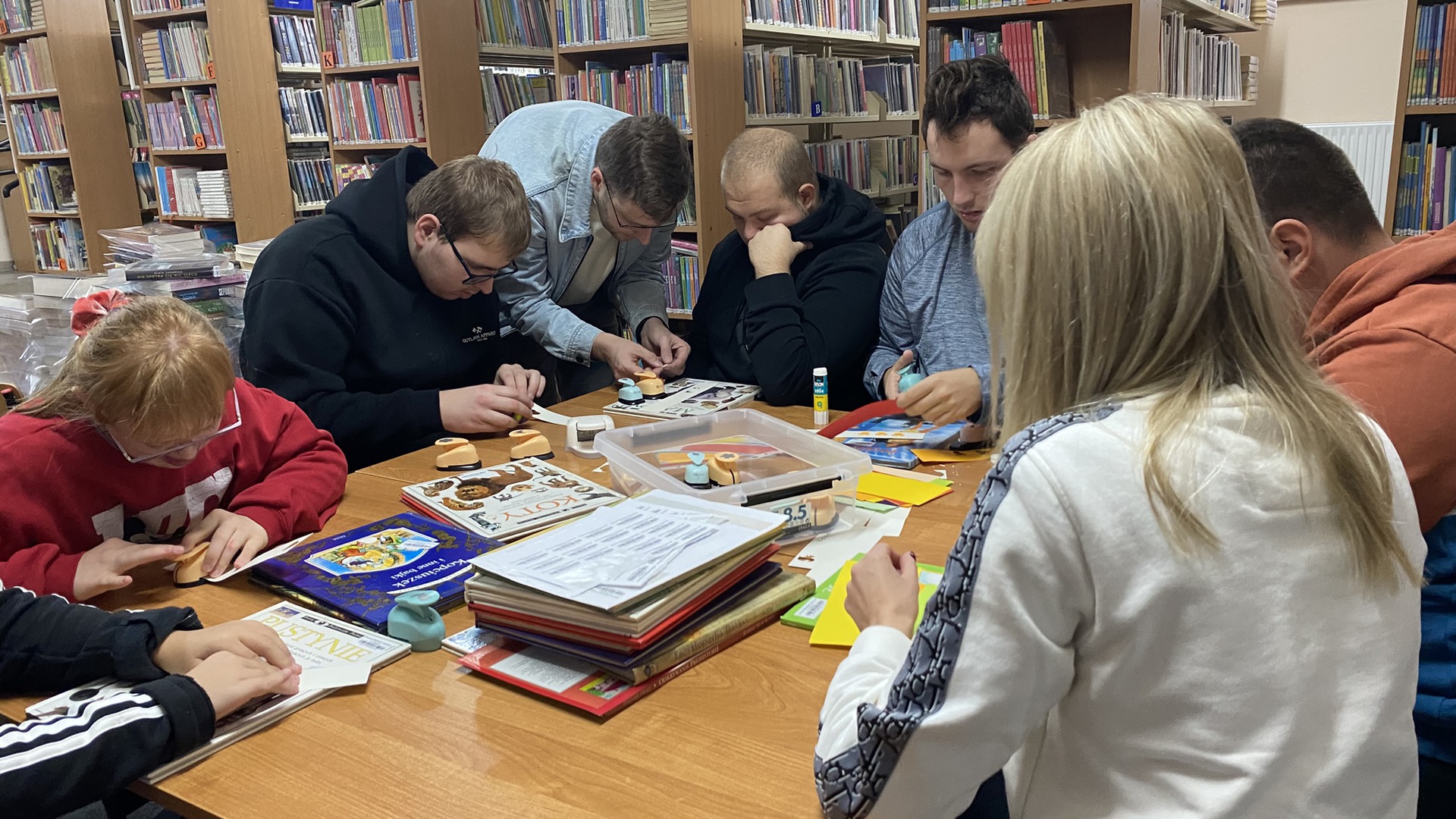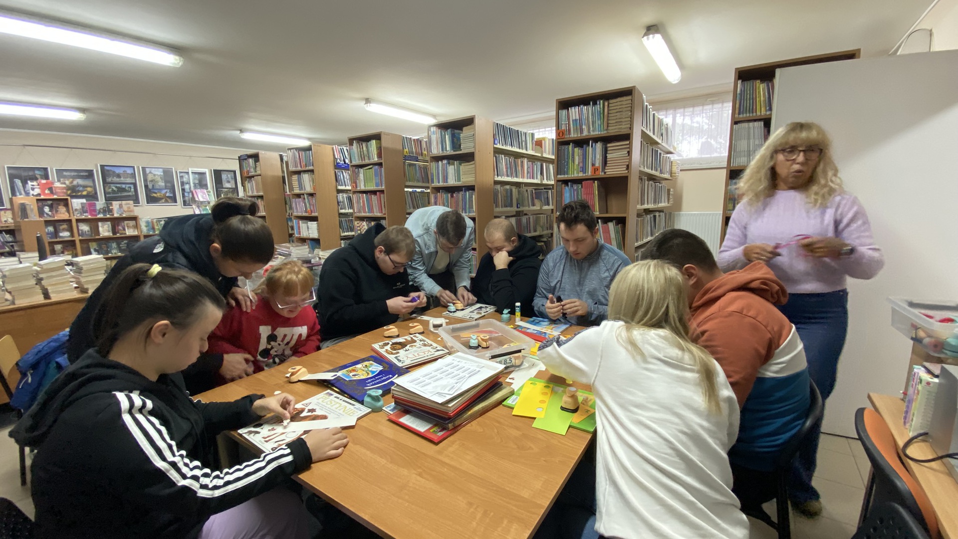 Kontynuując tradycję z poprzedniego roku w naszej bibliotece będziemy spotykać się na zajęciach plastycznych i warsztatach tematycznych z uczniami z Oddziałów Specjalnych świetlicy Szkoły Podstawowej w Chełmcu pod opieką pani Marzeny Kropiwnickiej oraz młodzieżą ze Szkoły Specjalnej przysposabiającej do pracy "Jesteś wart" pod opieką pani Anity Wójcik.