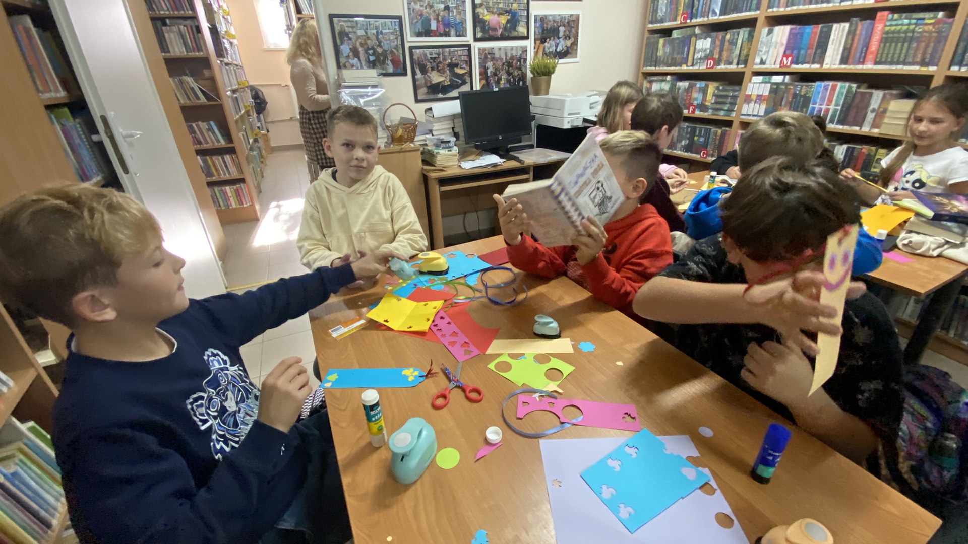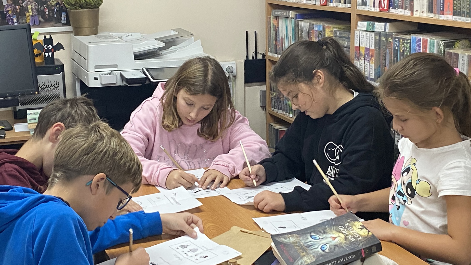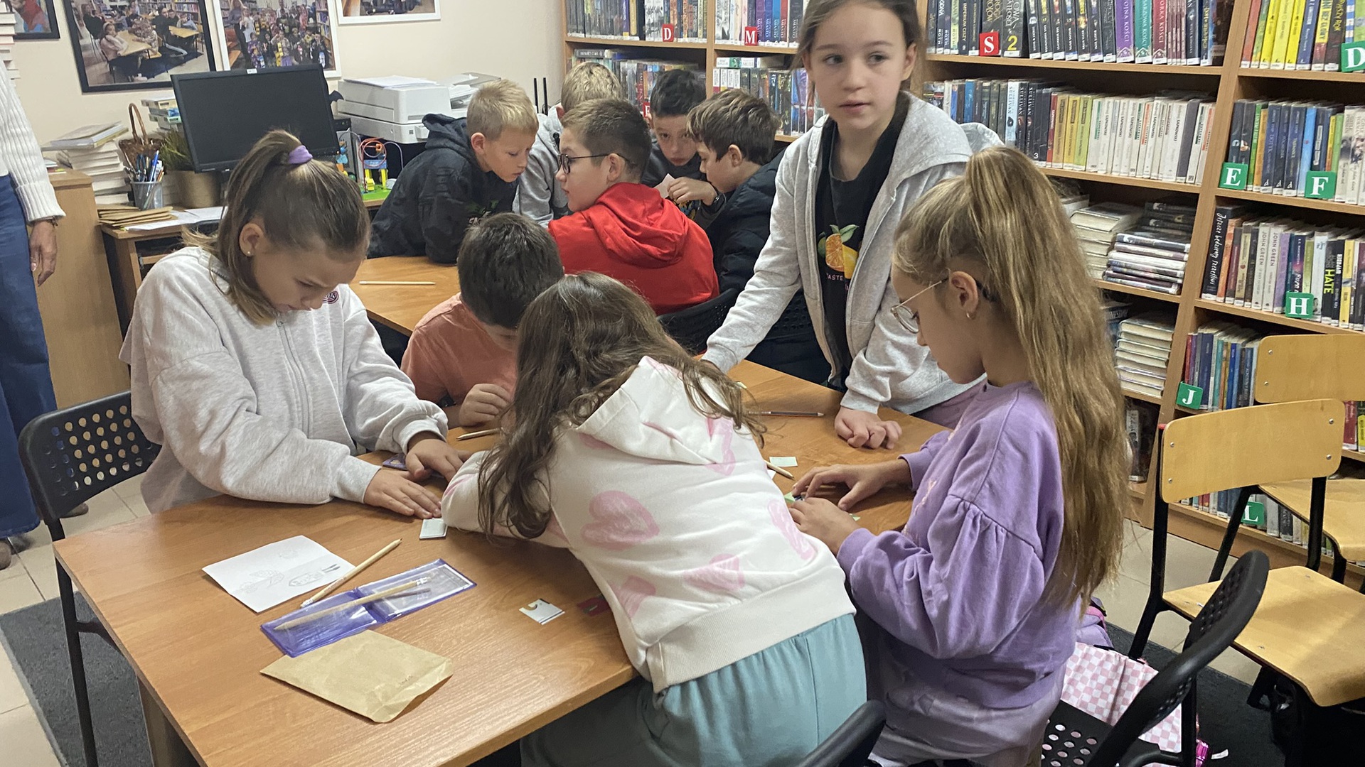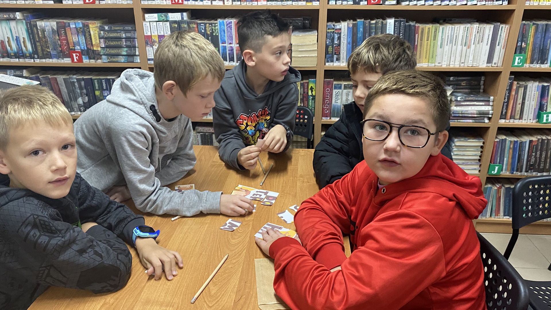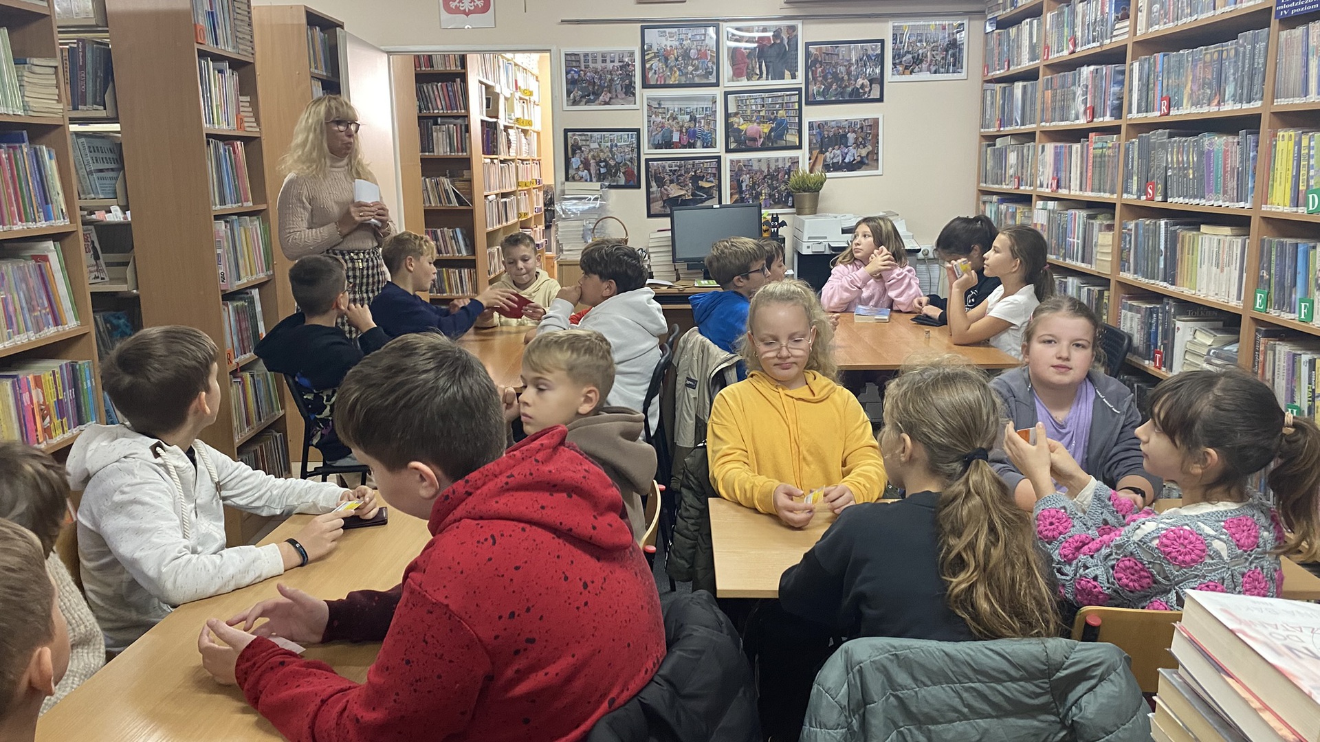 W październiku do Gminnej Biblioteki Publicznej w Chełmcu w ramach lekcji bibliotecznych zostali zaproszeni uczniowie klas IV Szkoły Podstawowej w Chełmcu. Pod opieką polonistek - p.Teresy Gwiżdż, p.Wioletty Janoty oraz p.Wioletty Monicy czwartoklasiści mogli zwiedzić naszą bibliotekę, dowiedzieć się o historii, zbiorach oraz pracy bibliotekarza. Dzieci uczestniczyły w zabawie "Escape room", która sprawiła im sporo frajdy, a także zrobili własne, kolorowe zakładki do książek. Punktem kulminacyjnym spotkania było ogłoszenie konkursu "Zostań Superczytelnikiem", którego celem jest zachęcenie dzieci do korzystania z naszego księgozbioru, rozbudzenie zainteresowań czytelniczych i literackich. Aby wziąć udział w konkursie uczniowie zostali członkami naszej biblioteki, otrzymali karty czytelnika oraz karty konkursowe, na których będą zbierać naklejki potwierdzające czytanie. Na najlepszych czekają nagrody.