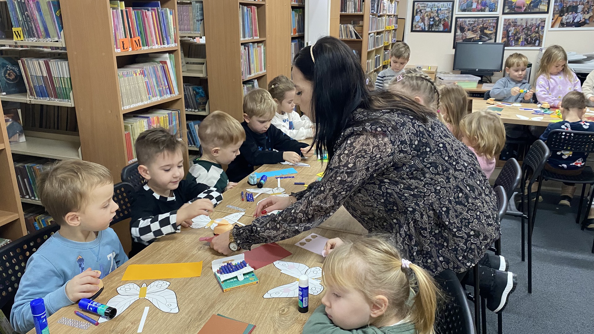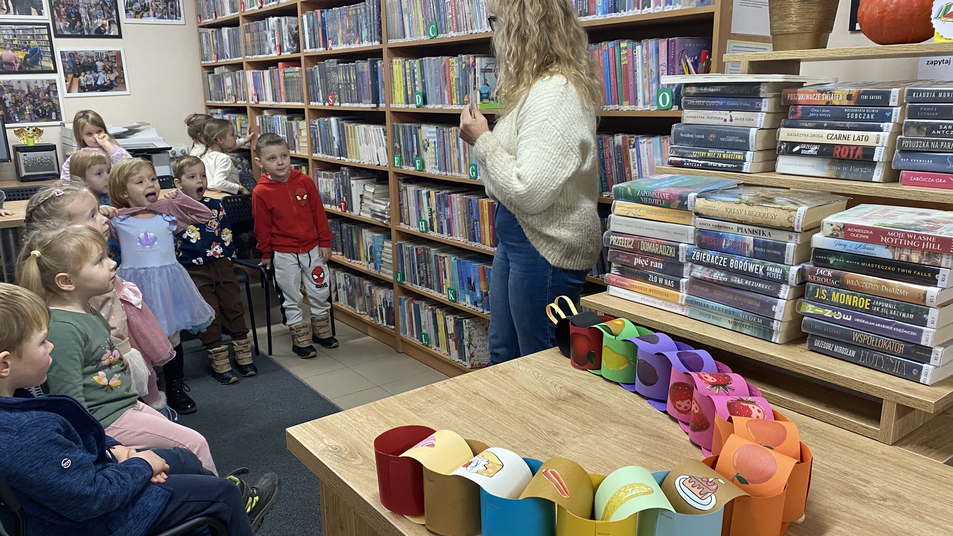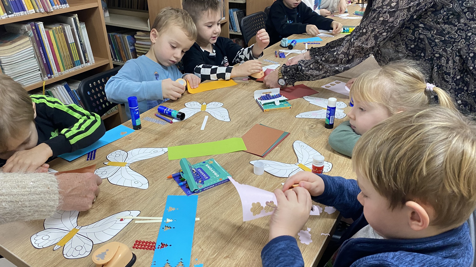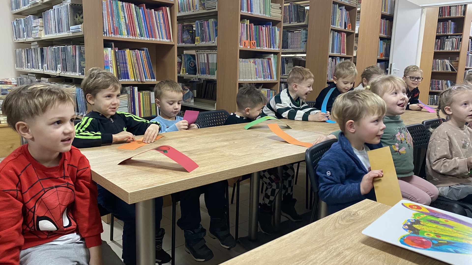 Czterolatki z ciekawością oglądały półki pełne książek, w których rozpoznawały ulubionych bohaterów z bajek, które czytają im rodzice. Z dużym zainteresowaniem wysłuchały bajki Erica Carle "Bardzo głodna gąsienica" uczestnicząc jednocześnie w tworzeniu długiej, żarłocznej gąsienicy. Podczas czytania utrwalały sobie znajomość liczb i dni tygodnia. Dzieci poznały proces przeobrażenia się gąsienicy w motyla - którego szablon pomalowały i ozdobiły cekinami, świetnie się przy tym bawiąc. Już wiemy, że jeszcze nieraz spotkamy się w bibliotece.