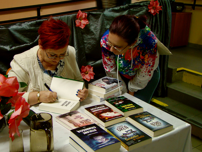 Zaproszenie na spotkanie przyjęli przedstawiciele chełmieckiego samorządu: Andrzej Tyrkiel, przewodniczacy Komisji Kultury oraz radny Jan Mróz. Licznie zgromadzeni czytelnicy byli ciekawi jak pisarka spędza wolny czas, skąd czerpie pomysły do swych powieści, jakie książki czyta. Biblioteka przygotowała pokarm dla duszy, a Stowarzyszenie "Razem dla Kultury" zadbało o pokarm dla ciała; były kołacze, chleb wiejski z łopaty, smalec, ogórki i inne pyszności.