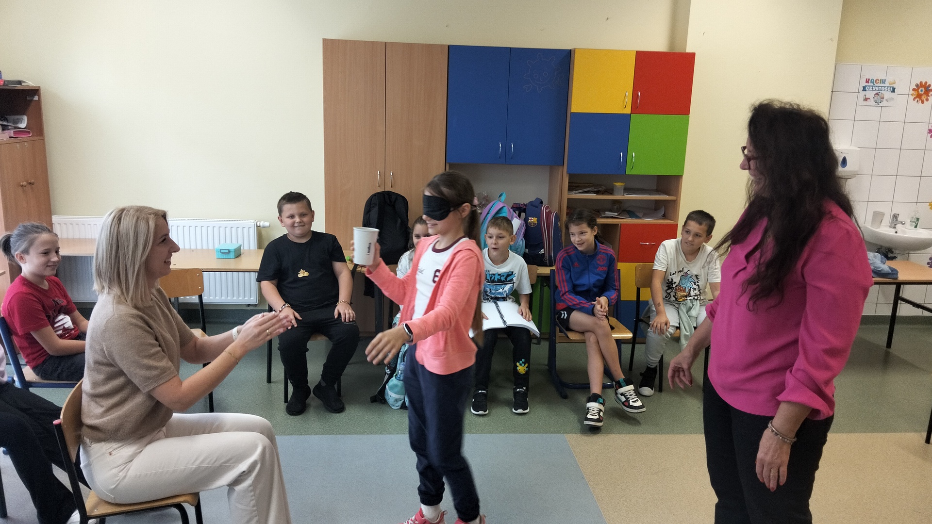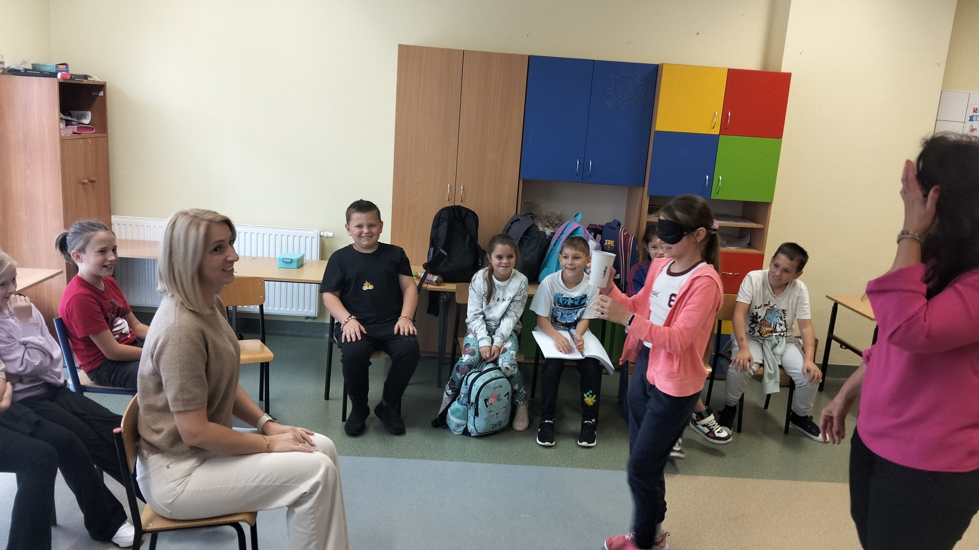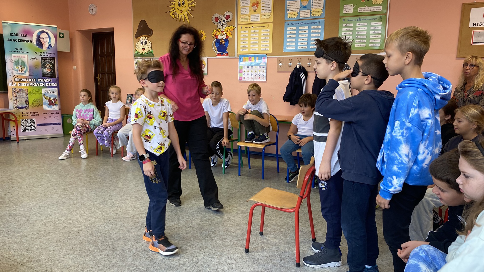 Nasz gość przeprowadził dla dzieci warsztaty oparte na treści książki "Sanatorium cudów". Uczniowie wykonywali kilkanaście zadań, które miały na celu pokazanie z jakimi wyzwaniami mierzą się w swoim życiu osoby niepełnosprawne. Choc na chwilę dzieci mogły przekonac się, jak to jest nie widzieć, nie słyszeć, nie móc się poruszać, być nadwrażliwym na dotyk.