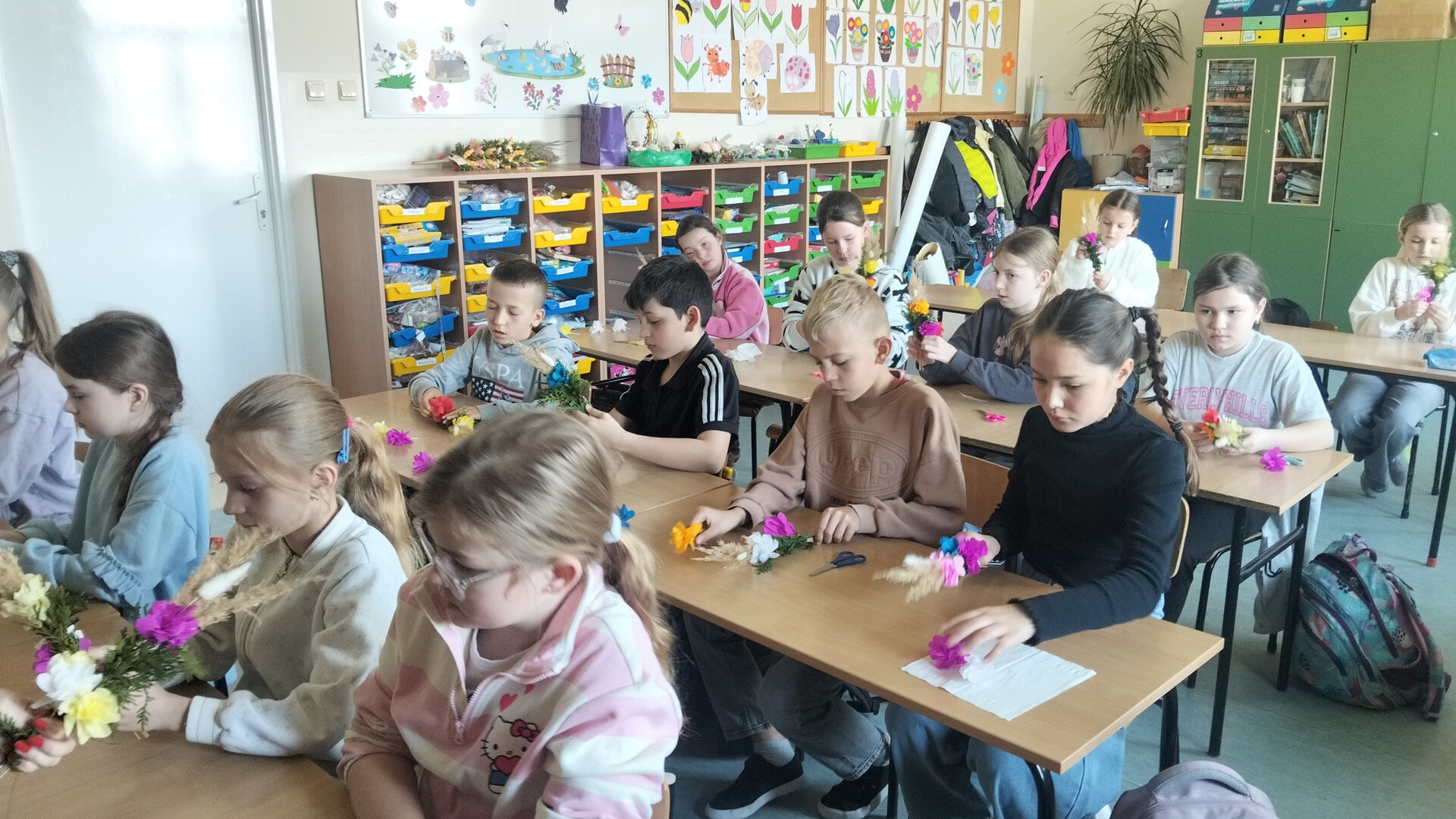 W części praktycznej zajęć uczestnicy robili palmy z własnoręcznie zrobionych kwiatów , bibuły i wstążek, które w nadchodzącą niedzielę palmową mogli zabrać do kościoła.