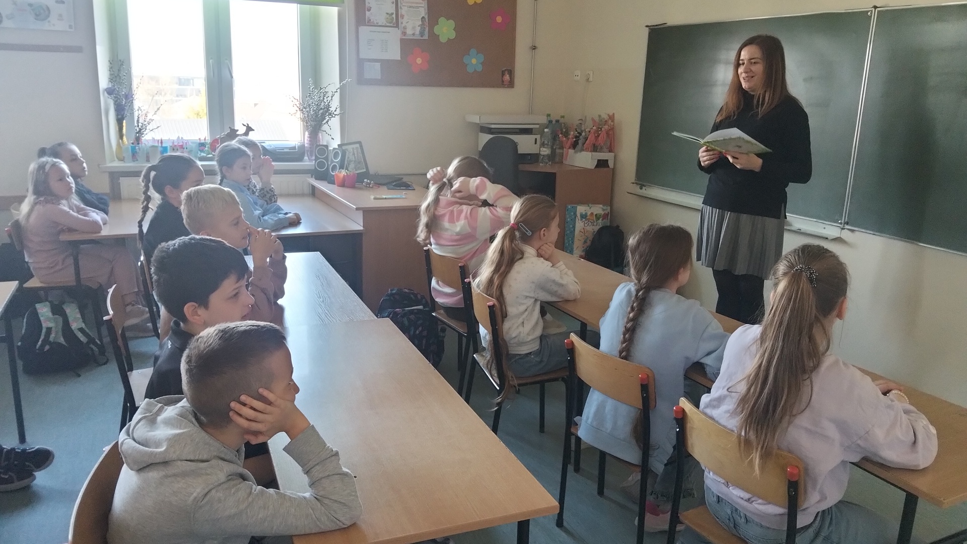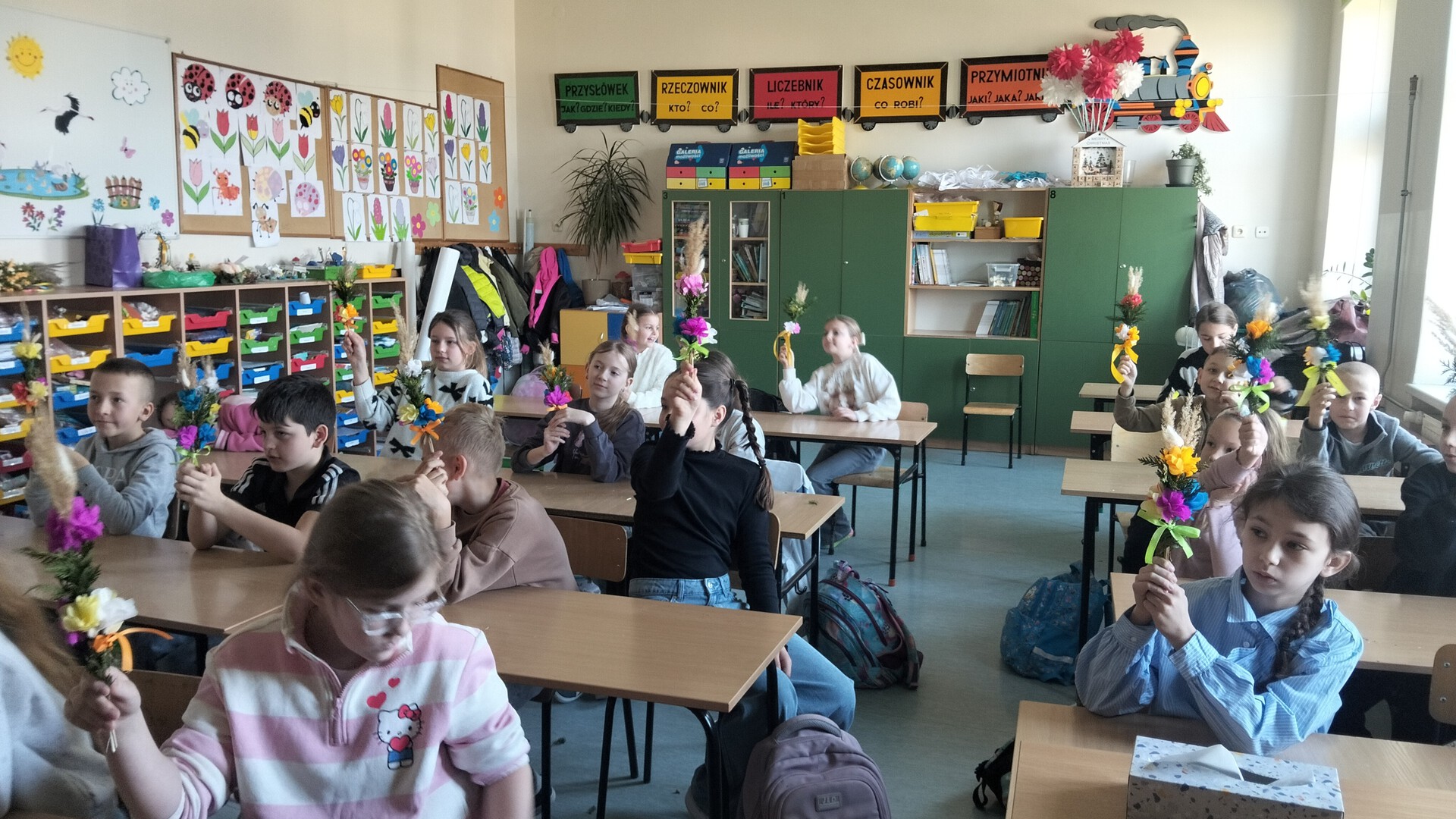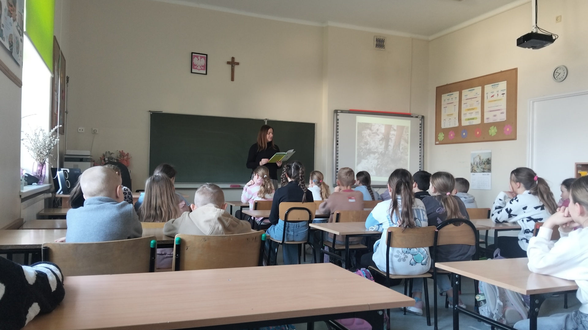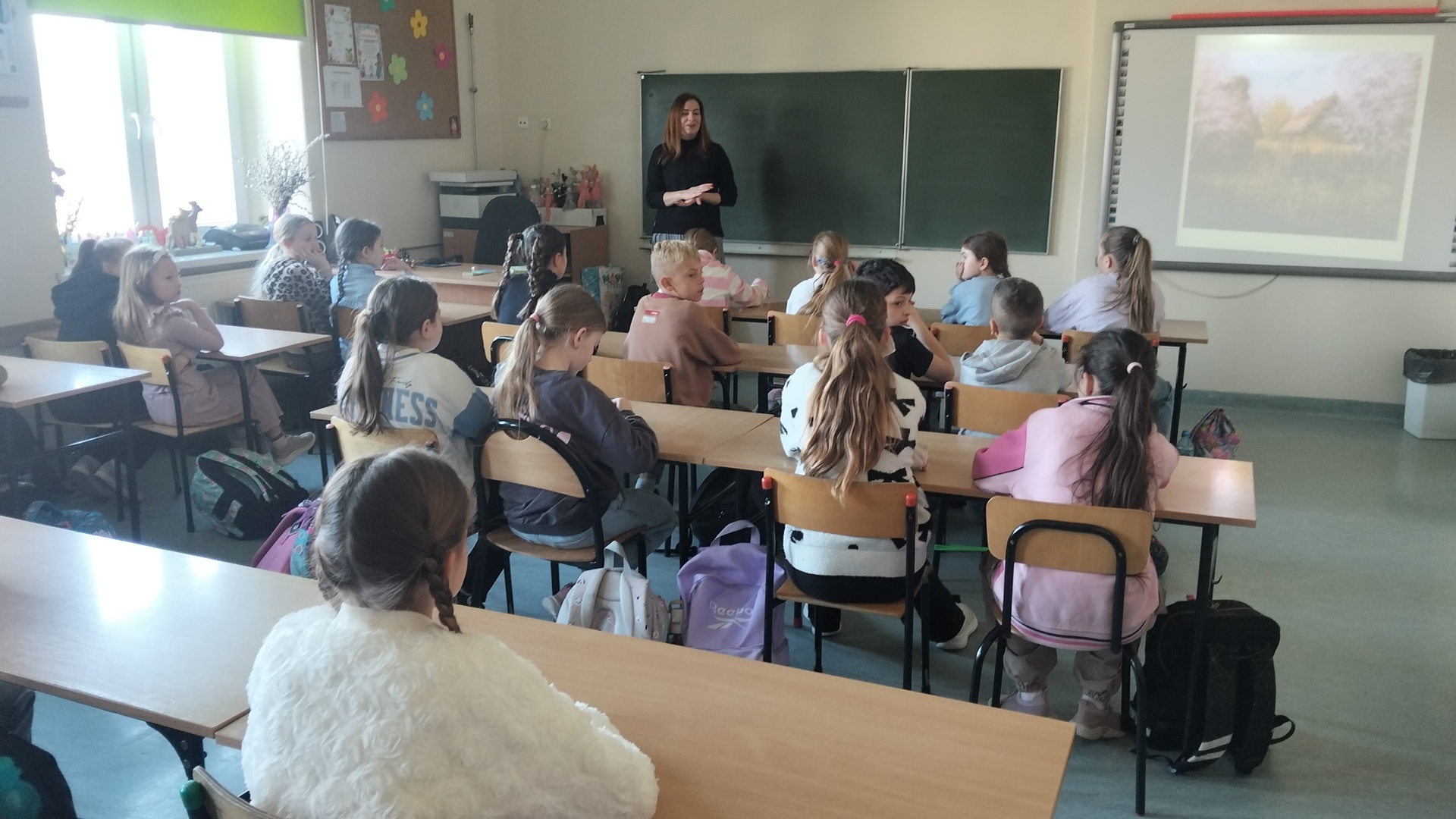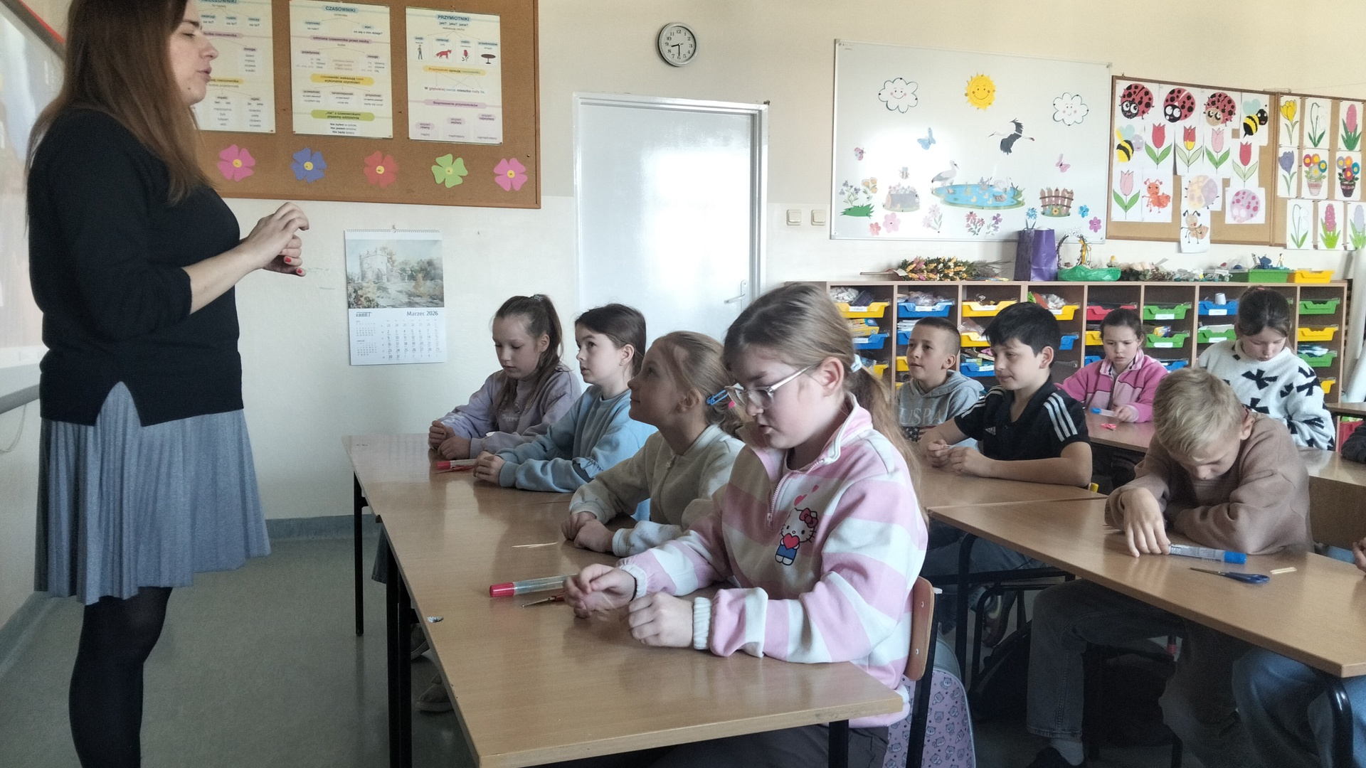 W części teoretycznej dzieci wysłuchały fragmentu nowej książki pani Izy pt."Wiosna". Poznali zajęcia towarzyszące codziennemu funkcjonowaniu na wsi budzącej się do życia po zimowym letargu. Dowiedziały się jak wyglądały przygotowania do świąt, jakie były zwyczaje i jak wyglądały obrzędy związane ze Świętami Wielkanocnymi. Część z nich dzieci doskonale znają i praktykują, ale były też takie, o których słyszały po raz pierwszy.